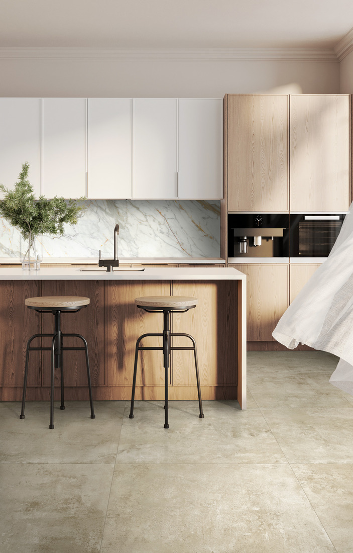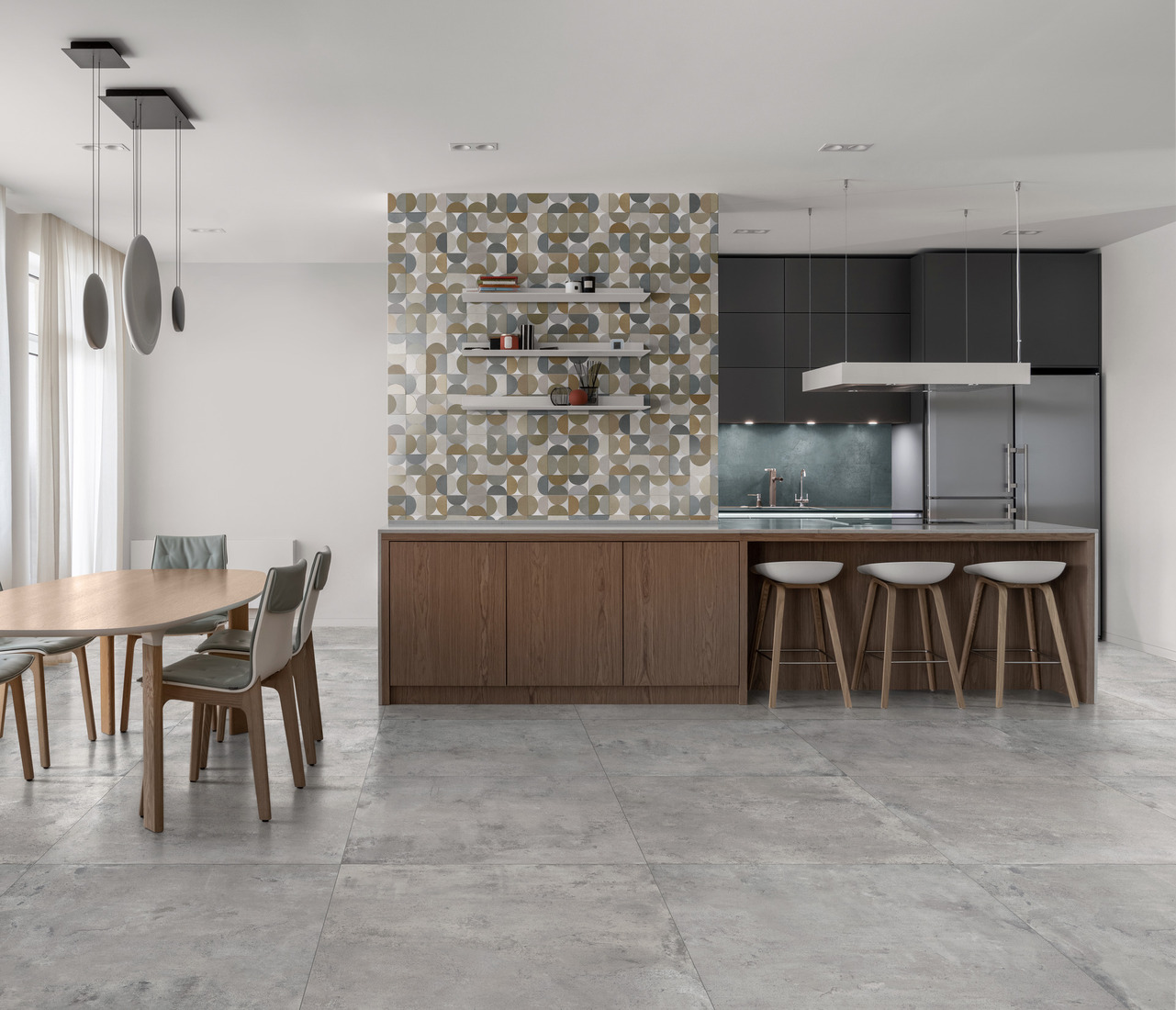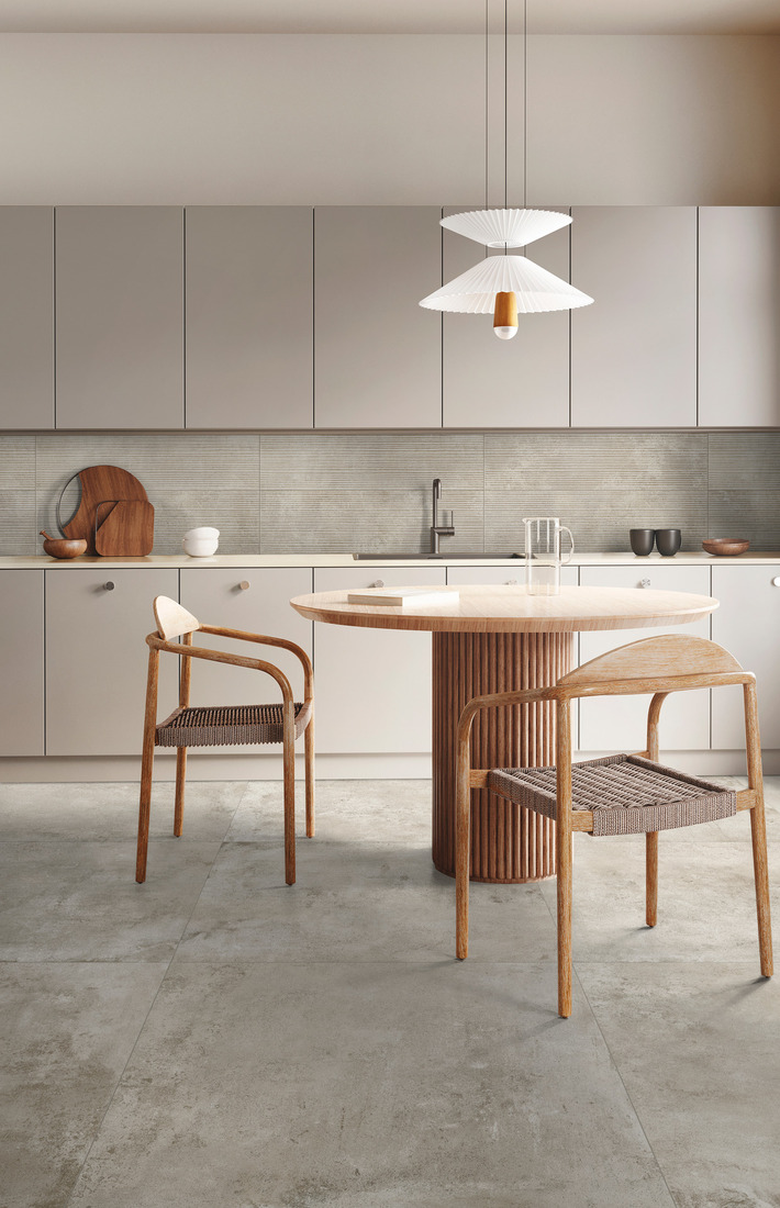 •Cuisine : Les sols et murs en carrelage aspect béton sont non seulement beaux mais aussi pratiques, résistants aux éclaboussures et faciles à nettoyer.