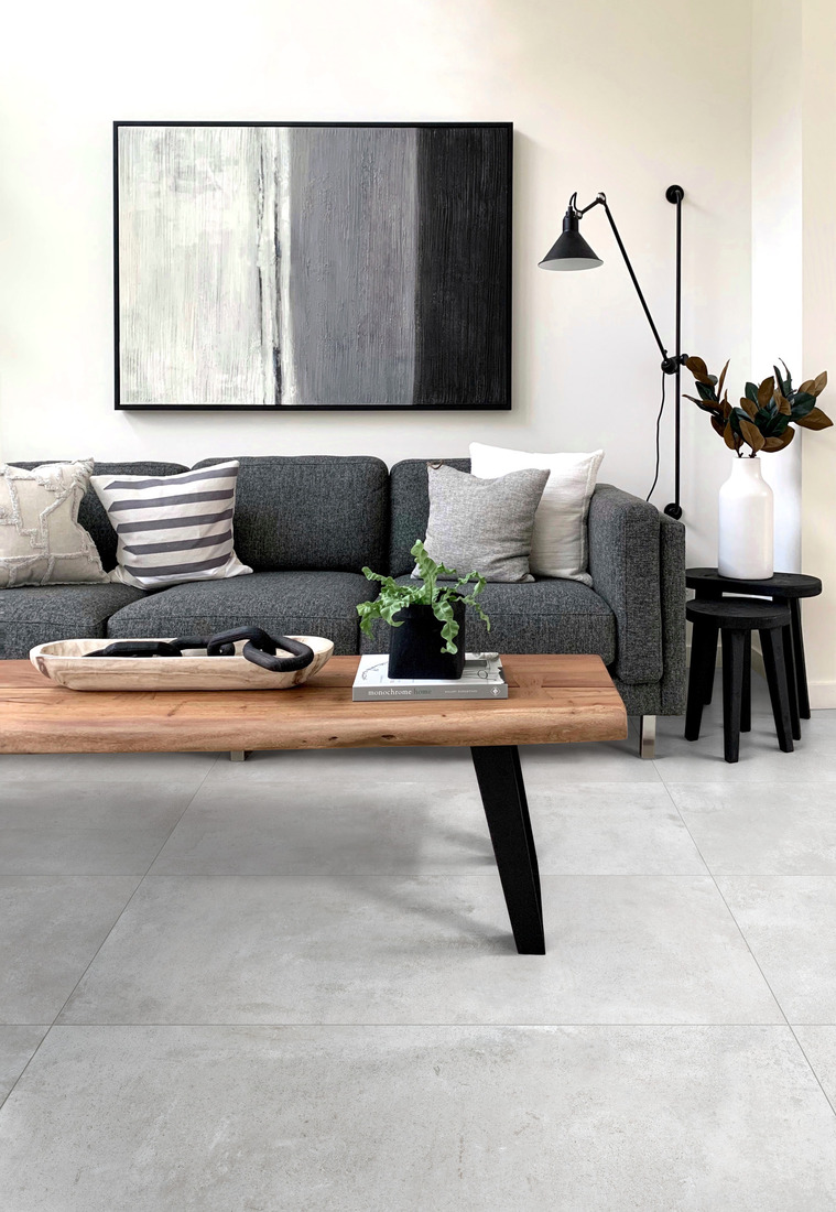 •Salon et Salle à Manger : Apportez une touche de sophistication urbaine avec des sols en carrelage aspect béton. Leur look épuré et moderne s’harmonise parfaitement avec des meubles en métal et en bois pour un style industriel.