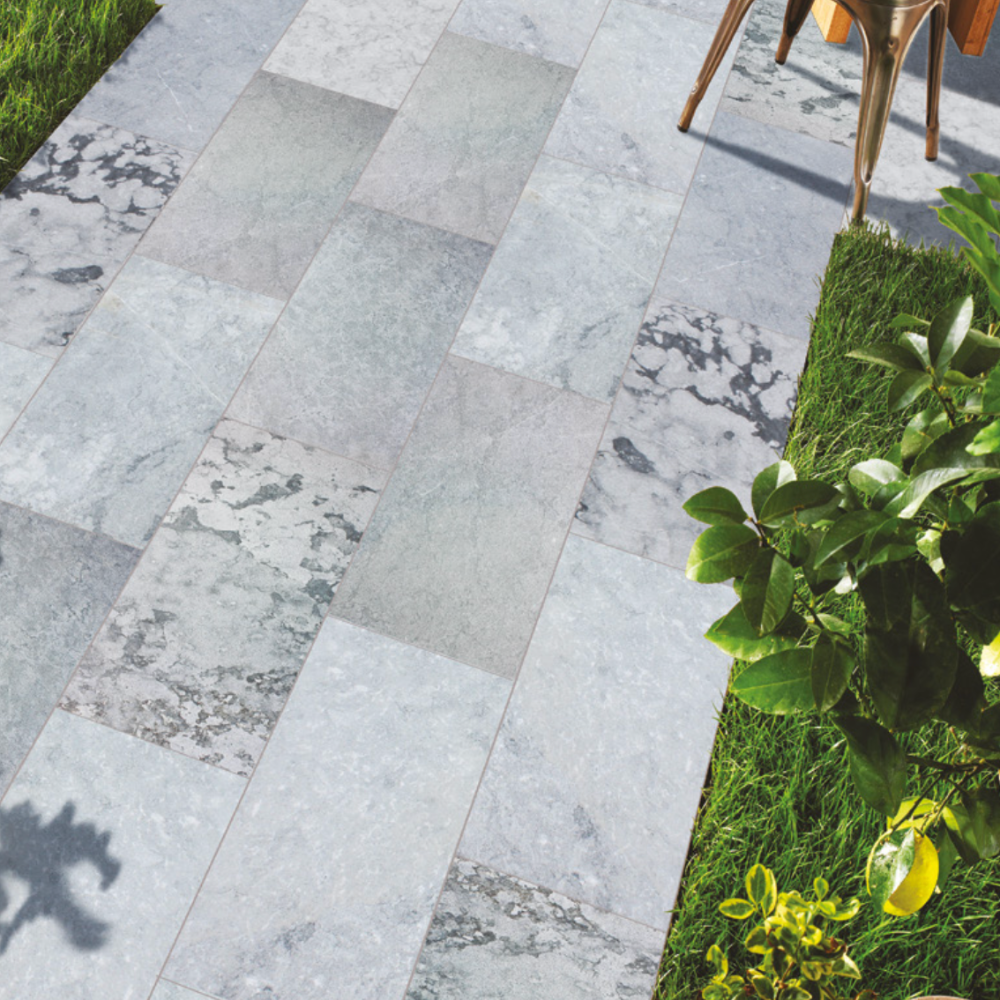 Combinez plusieurs formats pour créer des motifs élégants et dynamiques sur vos sols extérieurs.