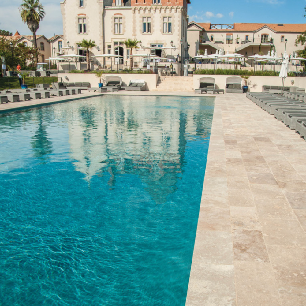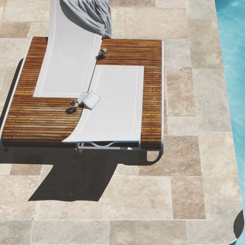 Le Travertin Classic Mix est une solution polyvalente et élégante pour tous types de projets intérieurs et extérieurs. Il s’adapte aussi bien aux terrasses, aux plages de piscine qu’aux espaces de vie intérieure grâce à sa résistance et son esthétique intemporelle. Disponible dans divers formats, il permet de réaliser des poses harmonieuses, que ce soit en opus, en pavé ou en dalle. Les margelles, angles et caniveaux viennent parfaire l’aménagement, apportant un raffinement supplémentaire aux bordures de piscines, allées et autres zones aménagées.