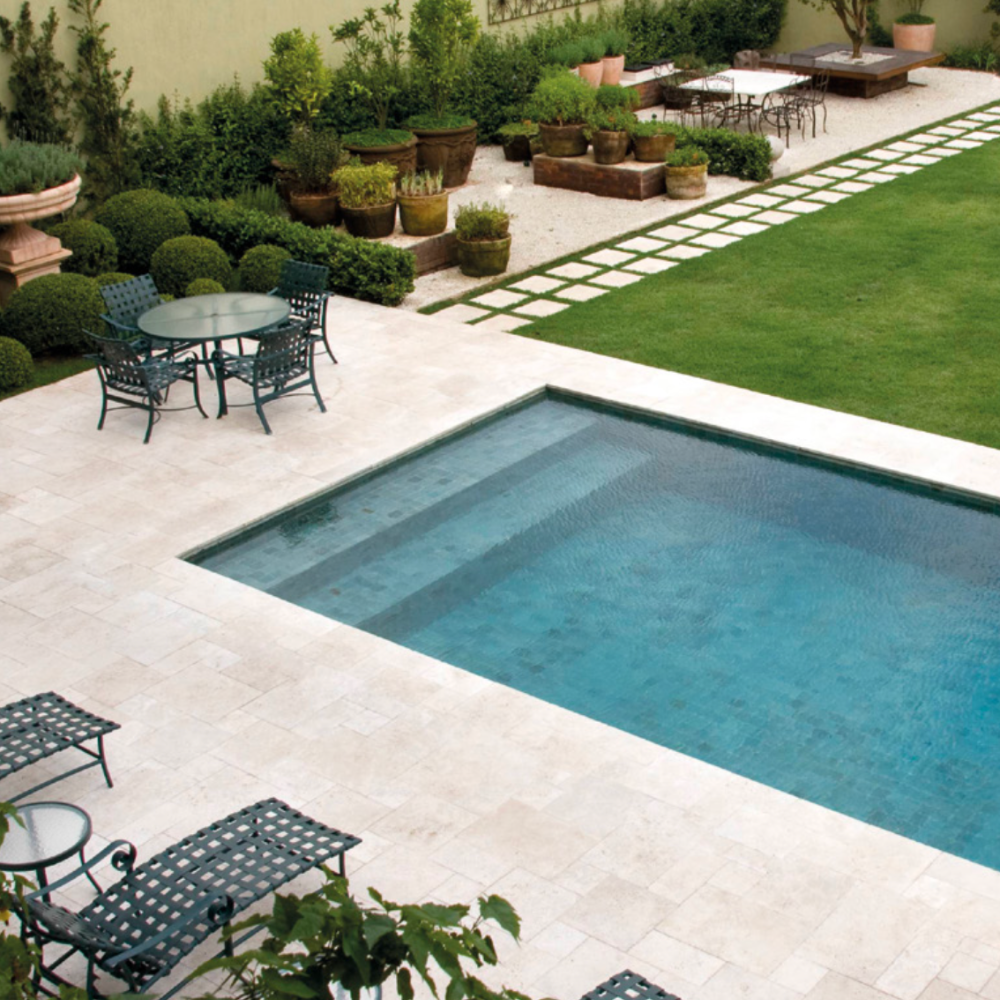 Pour compléter parfaitement votre projet, le Travertin Classic Light propose également des margelles et angles assortis :