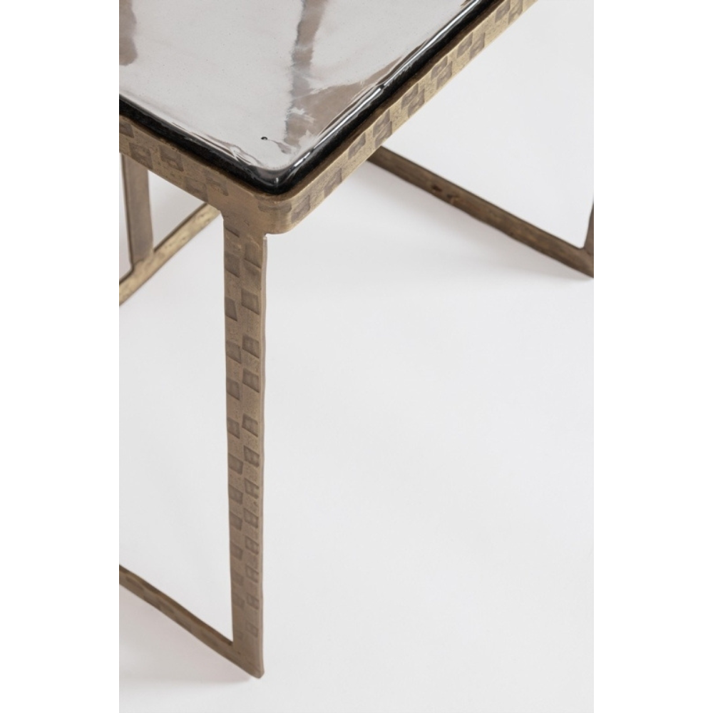 Apportez une touche unique et artisanale à votre espace avec ce set de 2 tables basses Zayla. Conçues en acier avec finition martelée et plaquée laiton, ces tables combinent robustesse et élégance. Leurs plateaux en verre naturel travaillé à la main (épaisseur 15-18 mm) confèrent un caractère exclusif à chaque pièce, avec des variations subtiles de forme et de couleur, faisant de chaque table une création unique.