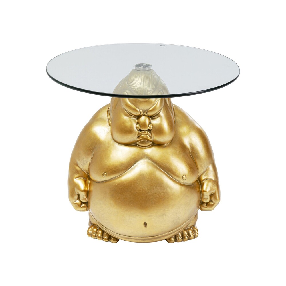 Ajoutez une véritable pièce d’art à votre intérieur avec la Table d’appoint Sumo Doré, une création qui marie force et originalité. Inspirée des combattants sumos japonais, cette table est bien plus qu’un simple meuble : son pied en forme de visage expressif symbolise la détermination et la puissance. Le pied en polyrésine dorée confère un look audacieux, tandis que le plateau en verre trempé de 1 cm d’épaisseur ajoute une touche de modernité élégante.