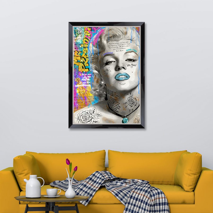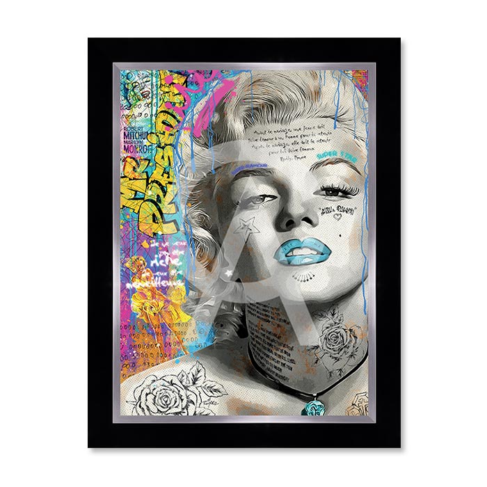 Le tableau Marilyn de Romaric capture l’essence intemporelle de Marilyn Monroe dans un style unique, mêlant l’art urbain et l’iconographie pop. Avec des éléments street art comme des graffitis colorés, des roses tatouées, et des touches vives de bleu, cette œuvre est à la fois moderne et audacieuse. Les superpositions de typographie et d’illustrations ajoutent de la profondeur, tout en renforçant la mystique de Marilyn.